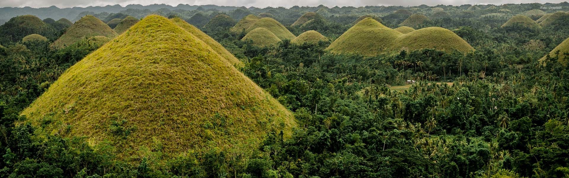 Weltbekannt ist Bohol vor allem für die Chocolate Hills, ein einzigartiges Naturphänomen aus mindestens 1.260 nahezu gleichförmigen, kegelförmigen Kalksteinhügeln, die sich über mehr als 50 Quadratkilometer erstrecken. Während der Trockenzeit färben sie sich schokoladenbraun und prägen das ikonische Bild der Insel.